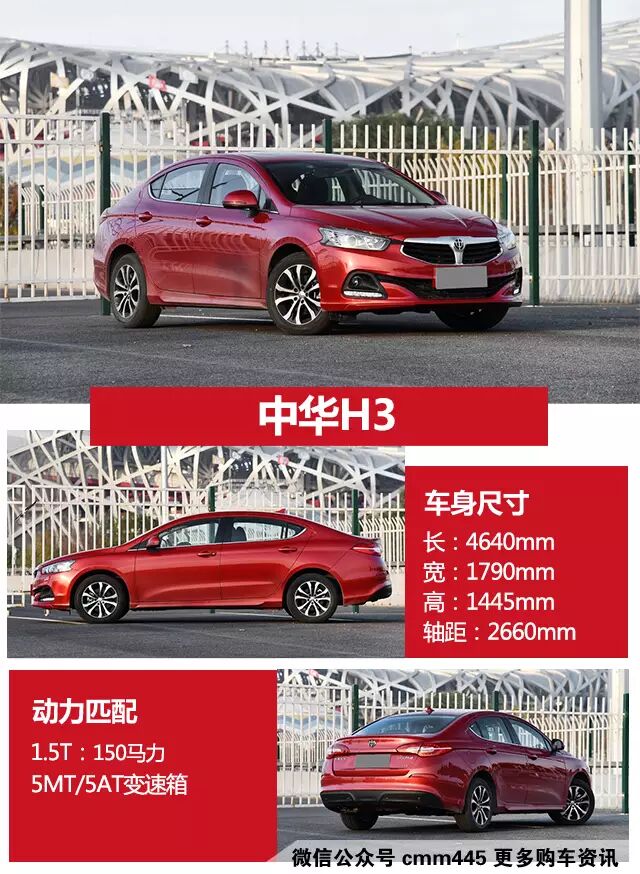 中华H3的尺寸为4640/1790/1445mm,轴距为2660mm,虽然长度和宽度不怎么出色,属于标准紧凑型车的水平,但是1445mm的车身却足够低矮,就是因为这个矮车身也给中华H3营造了更好的轿跑感觉,视觉感受更好。